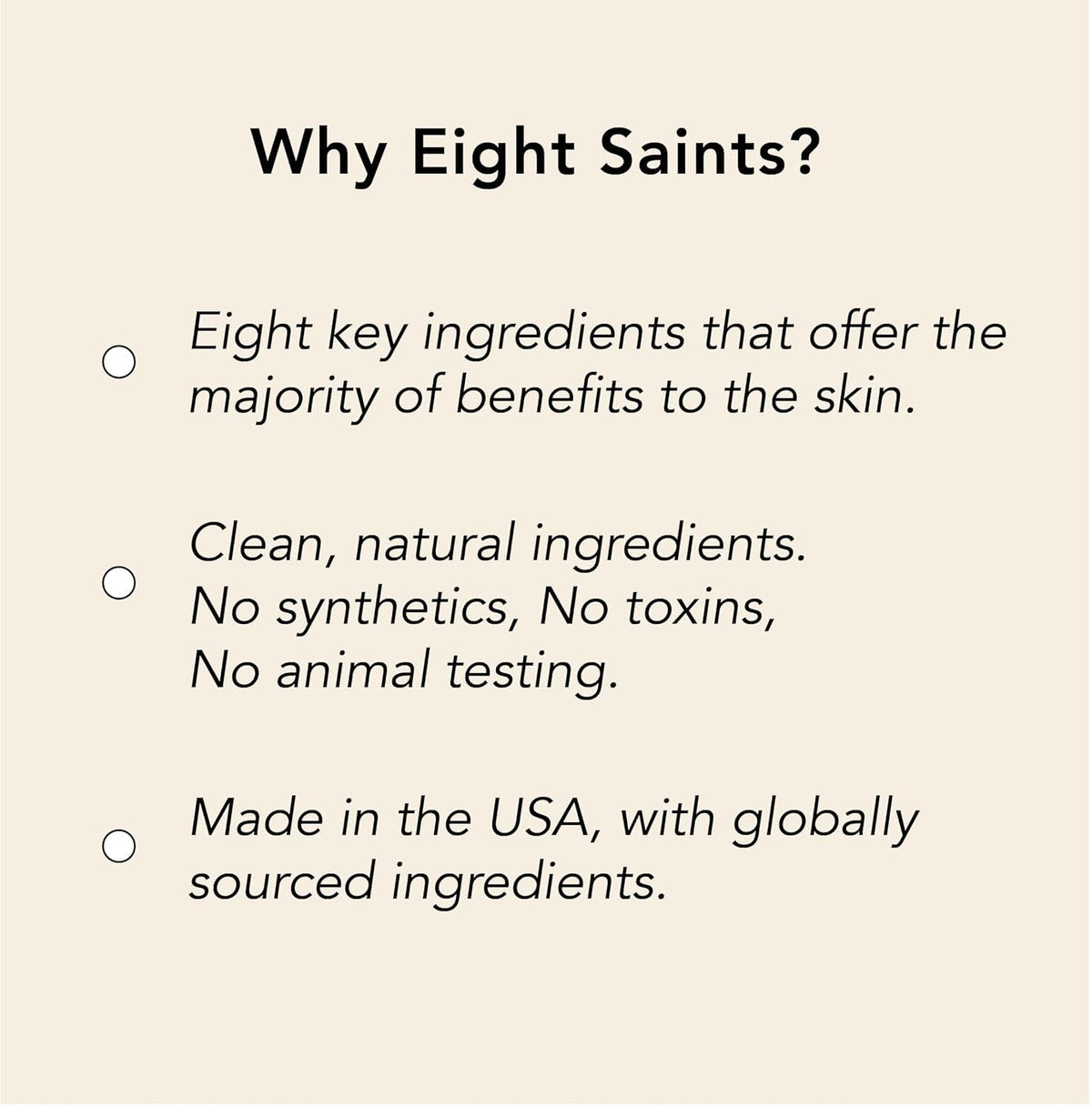 - We're all about providing truth and clarity in natural, effective skincare. In a crowded market with over-hyped “miracle ingredients”, we found most ingredients don't produce results. We drilled down to 8 key ingredients that generated the majority of the benefits for your skin: Our "Eight Saints".