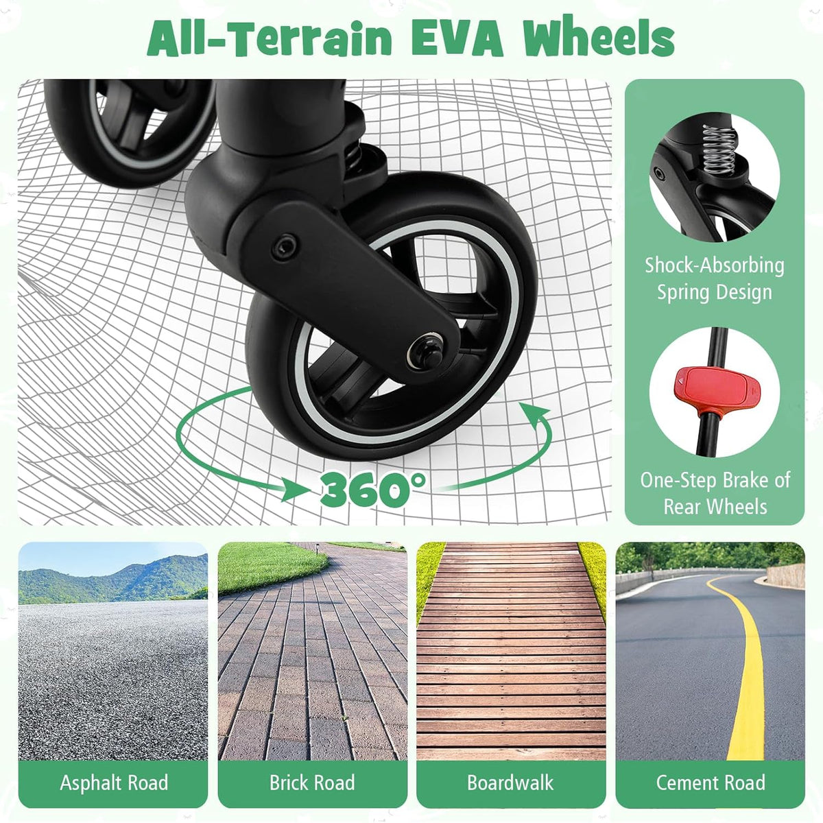 • All-Terrain EVA Wheels: Made of premium EVA, all the four wheels fit different kinds of terrains well, such as asphalt, brick, boardwalk and cement road. The 2 universal front wheels are designed with shock-absorbing springs for higher stability during rolling.